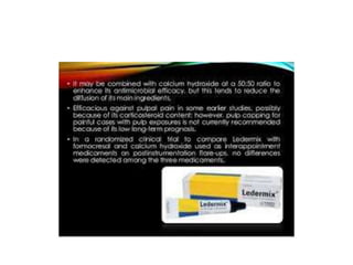 This document discusses root canal irrigation and intracanal medicaments. It outlines the objectives and characteristics of an ideal irrigation system, including removing debris, being bactericidal, and dissolving tissue. EDTA and sodium hypochlorite are described as common irrigation solutions used to remove the smear layer. Factors influencing irrigation efficacy and methods of irrigant delivery are covered. Potential complications of sodium hypochlorite accidents and their treatment are summarized. Finally, the document briefly discusses root canal medication and categories of intracanal medicaments.