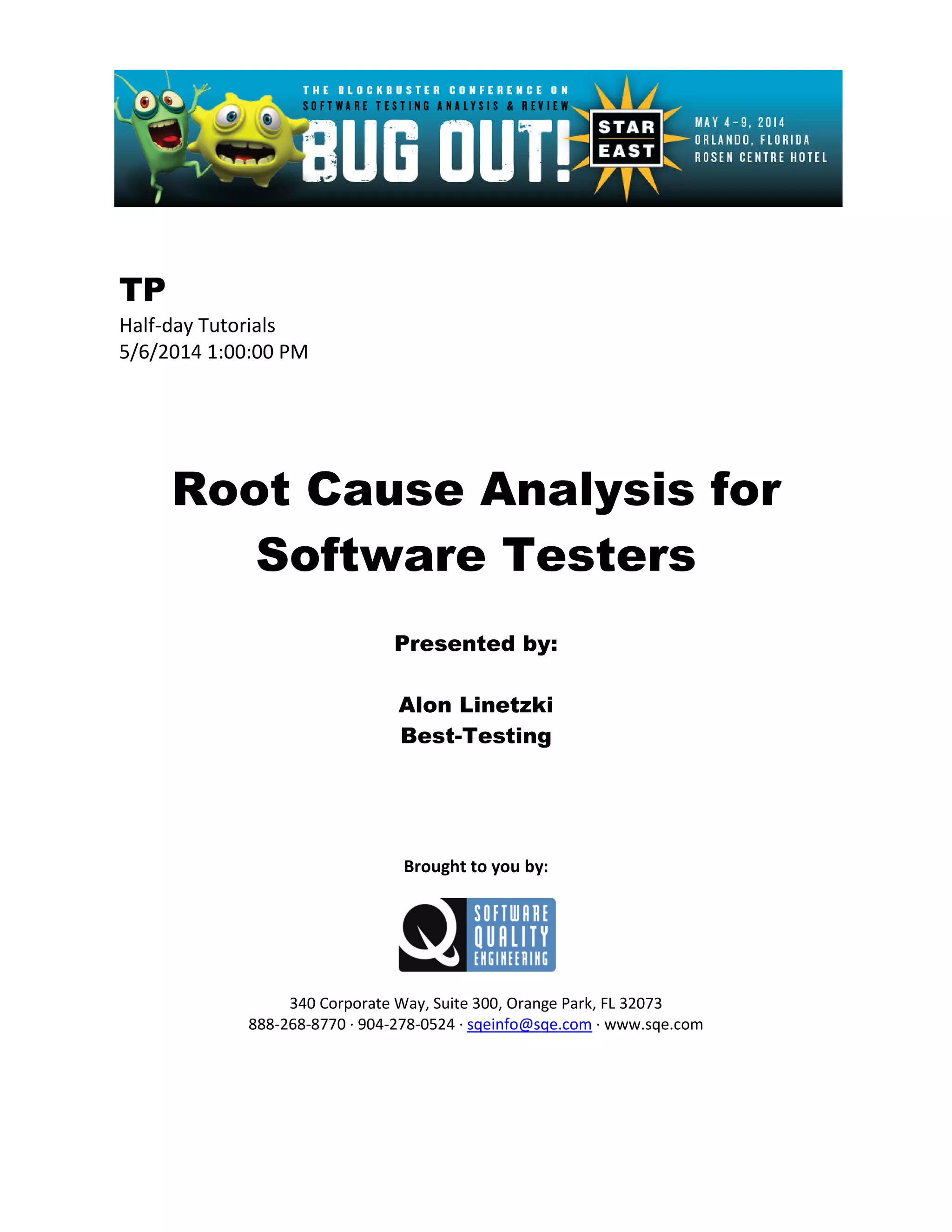 The document outlines a half-day tutorial on root cause analysis (RCA) for software testers, presented by Alon Linetzki of Best-Testing. It details his extensive experience in testing and quality assurance, the structure of the course, and the importance of RCA in identifying and resolving underlying issues in software defects. Additionally, it includes a variety of methods, case studies, and guidelines for effectively implementing RCA in testing processes.