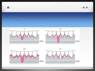 This document discusses various root coverage procedures for treating gingival recession. It begins by defining gingival recession and classifying types. Nonsurgical treatments including monitoring, desensitizing agents, and restorations are outlined. Surgical options such as laterally positioned flaps, double papilla flaps, coronally positioned flaps, free gingival grafts, and subepithelial connective tissue grafts are described in detail. Factors in selecting a procedure and modifications to techniques are also summarized. The document concludes that careful case selection and surgical management are key to achieving successful root coverage outcomes.