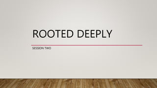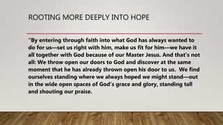 This document discusses rooting more deeply into hope through faith in God. It begins by quoting passages from Romans that discuss how through faith we are made right with God and given hope through the Holy Spirit. It then defines hope as an optimistic state of mind about desired future outcomes. The document contrasts easy hope, which is surface level, with hard hope, which requires deeper roots and patient effort. It encourages rooting into the fountain of hope that God has placed within believers, which gives a good future outlook even in difficult times. Drinking from this fountain of hope causes relaxation and seeing beyond present struggles.