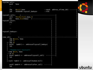 This document describes techniques for creating rootkits on Linux x86 systems. It discusses obtaining the system call table through the interrupt descriptor table and IDT register. It explains how to hook system calls by modifying the system call table entries or using inline assembly. The document also covers abusing debug registers to generate breakpoints and divert execution to custom handlers without modifying code. Overall, the document provides an overview of common rootkit techniques along with code examples for implementing hooks at the system call level and bypassing detection on Linux.