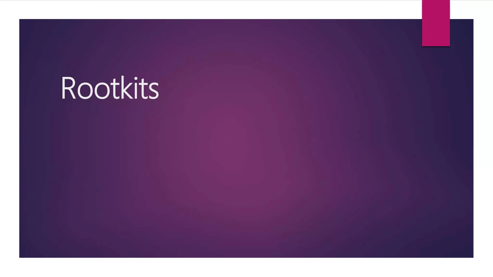 Rootkits are collections of tools used by hackers to gain administrative privileges on compromised machines and help hide other malware. They allow unauthorized access and control over a computer without the user's knowledge by executing files, monitoring activity, and hiding their presence. Rootkits work by using a dropper to install a loader that loads the rootkit code into memory to covertly operate. There are different types of rootkits that hide in various parts of the computer like the user mode, kernel, firmware, or through virtualization but they are all very difficult to detect.