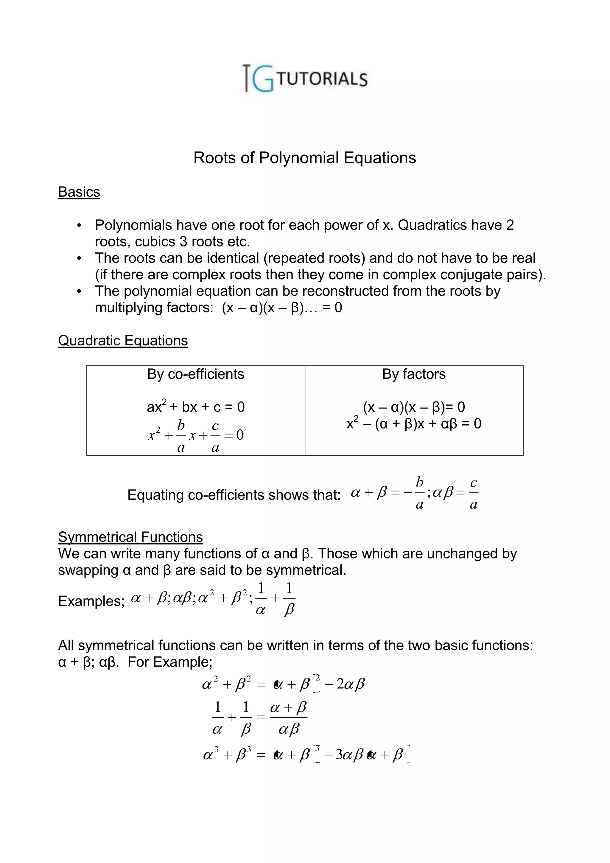 2) Quadratic equations can be solved by setting the coefficients equal to functions of the roots, or by factorizing the equation in terms of the roots.