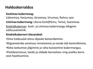 HalduskorraldusEestimaa kubermang: Läänemaa,Harjumaa, Järvamaa, Virumaa, Ruhnu saar.Liivimaa kubermang: Lõuna-Eesti(Pärnu, Tartu), Saaremaa.Kindralkuberner- Eesti- ja Liivimaa kubermangu kõrgeim valitsusametnik.Kindralkuberneri ülesanded:Oma haldusalal oleva sõjaväe kamandamine.