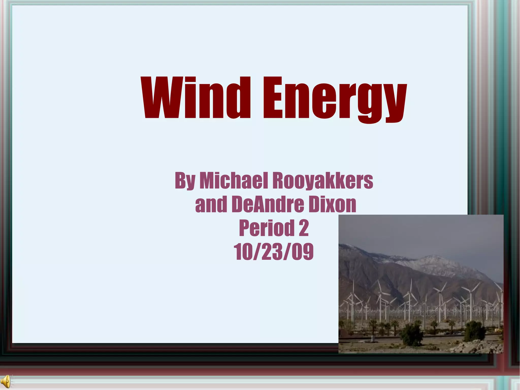 Wind energy is a renewable resource that is created by uneven heating of the Earth's atmosphere by the sun, which causes wind. Wind turns turbines to generate electricity, which is then transferred through power lines to homes and businesses near wind farms. While wind energy has the disadvantages of being intermittent when winds are low, it has the major advantage of being a non-depleting renewable resource. The future of wind energy looks promising as technology improves to harness more energy from wind through larger turbine blades.