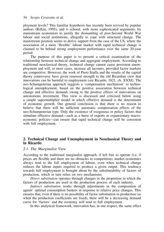 This document examines the relationship between technological change and unemployment, arguing against the neoclassical view that market mechanisms restore full employment after technical disruptions. It critiques the notion of autonomous investment and asserts that significant factors like income distribution and demand policies determine employment levels amidst technological change. The authors suggest that persistent unemployment can occur due to structural changes and emphasize the need for effective demand factors to achieve growth and employment stability.