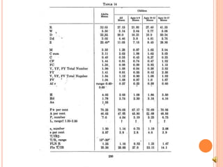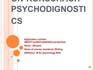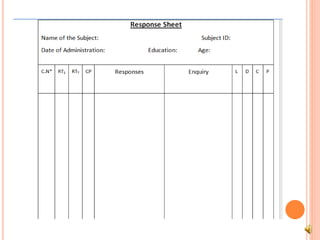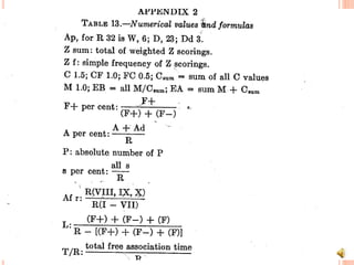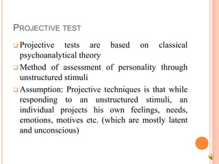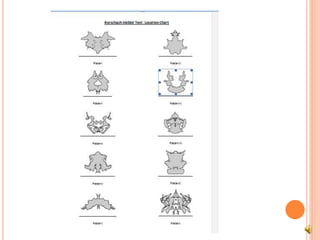 The document discusses projective tests and provides details about the Rorschach inkblot test. It describes the key characteristics and assumptions of projective tests. It explains the different categories of projective tests and provides examples. It then focuses on describing the administration, scoring, and interpretation of the Rorschach test, outlining the various response determinants, content categories, qualitative signs, and their clinical implications.