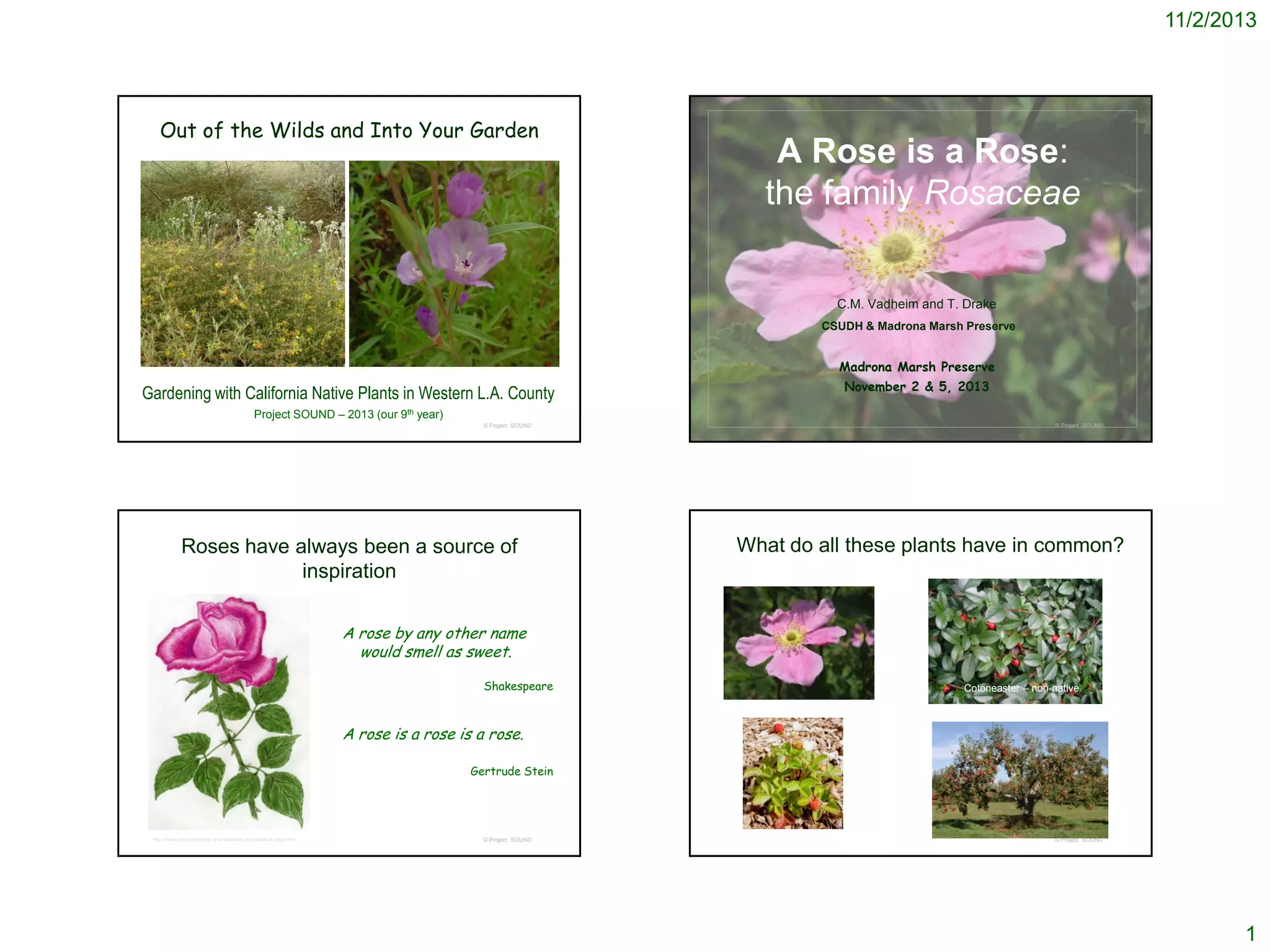 The document discusses the rose family (Rosaceae), which includes around 3000 species with significant economic importance, such as apples, cherries, and ornamental shrubs. It highlights California native roses, their habitats, ecological roles, and various uses, including food and ornamentation. Additionally, it touches on the complexities of rose taxonomy, invasive species, and the various characteristics shared within the rose family.
