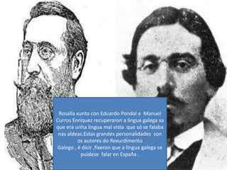 Rosalía xunto conEduardo Pondal e Manuel Curros Enríquez recuperaron a lingua galega xa que era unhalingua mal vista que só se falabanasaldeas.Estas grandes personalidades son os autores do RexurdimentoGalego , é dicir ,fixeron que a lingua galega se puidesefalar en España .