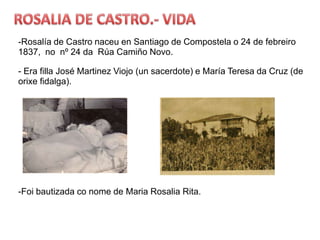 ROSALIA DE CASTRO.-VIDA-Rosalía de Castro naceu en Santiago de Compostela o 24 de febreiro 1837, no nº 24 da Rúa Camiño Novo. - Era filla José Martinez Viojo (un sacerdote) e María Teresa da Cruz (de orixefidalga).-Foibautizada co nome de Maria Rosalia Rita.