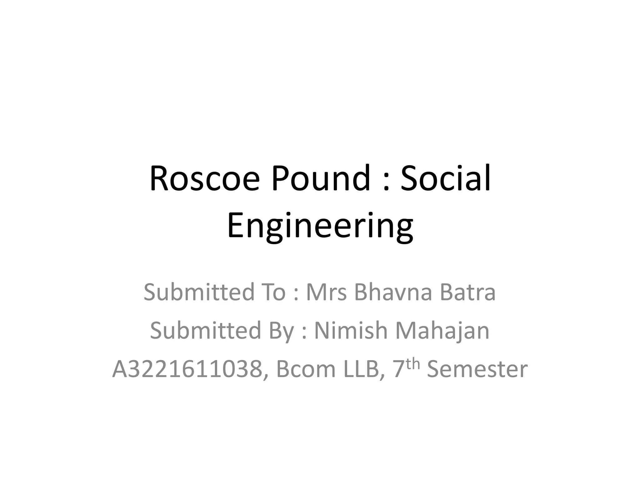 Roscoe Pound, born in 1870, introduced the concept of social engineering, equating lawyers to engineers who must work to uplift societal interests. He categorized interests into individual, public, and social, emphasizing the need for a legal system to recognize and protect these interests through established jural postulates. Despite its significance, social engineering has faced criticism for oversimplifying society's complexities and neglecting the evolving nature of law.