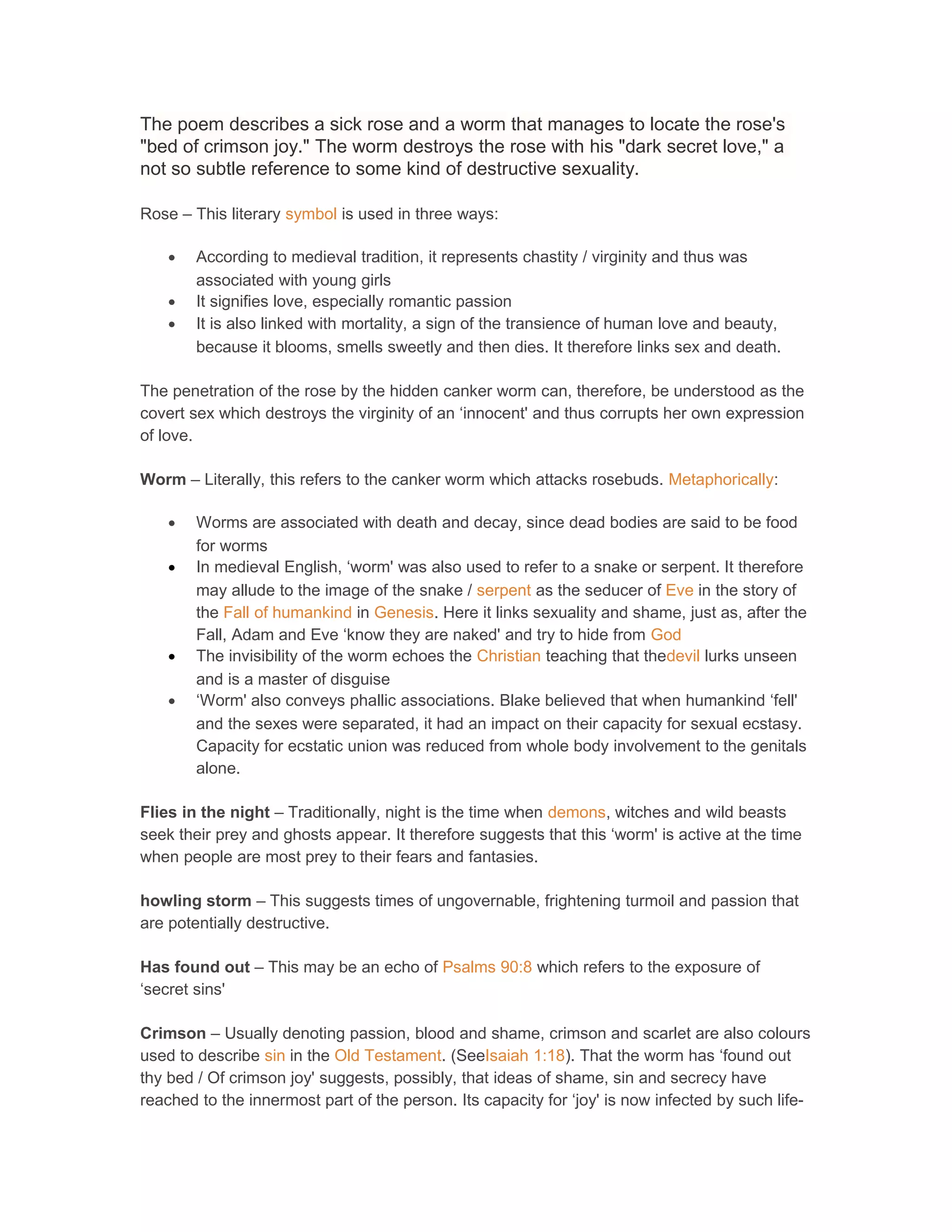 The poem describes a sick rose that is corrupted by a hidden worm. The worm finds and destroys the rose's "bed of crimson joy", which can be interpreted as the worm destroying the rose's virginity through covert sex. The rose symbolizes love, beauty, and mortality. The worm represents death, decay, sexuality, and the devil. The poem serves as a warning about parasitic relationships where one person consumes and destroys the other.