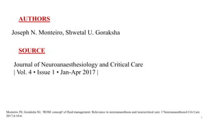 This article discusses the 'ROSE concept' of fluid management proposed by Malbrain et al. and its relevance for neuroanaesthesia and neurocritical care. The ROSE concept has four phases - resuscitation, optimisation, stabilisation, and evacuation. During the resuscitation phase, fluids are given aggressively to restore circulation. The optimisation phase aims for a neutral fluid balance to ensure tissue perfusion. Stabilisation focuses on maintaining neutral or negative balance. Finally, evacuation uses diuretics and albumin to achieve negative balance and 'de-resuscitation' in stable patients with fluid overload. The article concludes that while restriction of fluids is important to prevent increased intracranial pressure, neurosurgical