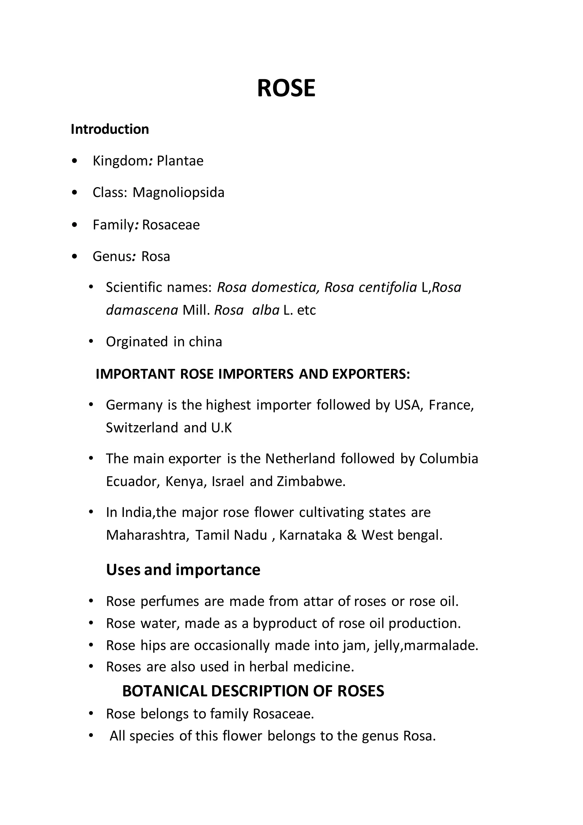 - Roses originated in China and are widely cultivated globally for their flowers and other uses. The top rose importing countries are Germany, USA, France, Switzerland, and UK, while the main exporters are the Netherlands, Columbia, Ecuador, Kenya, Israel, and Zimbabwe.