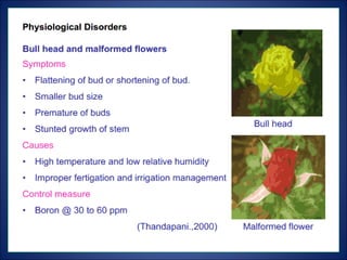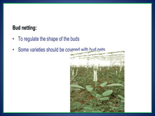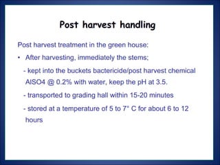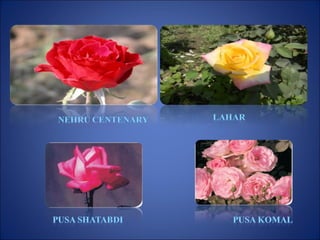 This document provides information about rose cultivation. It begins with an introduction to roses and then discusses their importance, uses, botanical description, classification, varieties suitable for protected cultivation, propagation methods, climate requirements, soil needs, cultural practices like irrigation, fertilization, planting, use of plant growth regulators, disease management, effects of preservatives on vase life, transport, and yield. The document contains detailed information on growing roses successfully as a flower crop.