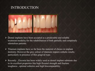 This document discusses a study evaluating osteoblastic activity on zirconia discs with different surface treatments. It is divided into three groups: Group I (no surface treatment), Group II (sandblasting and acid etching), and Group III (UV radiation). SEM analysis found Group I had few parallel lines and pits/cracks, Group II had a porous surface with prominent changes, and Group III had lines/pits/cracks. Results showed Group I had few osteoblastic cell colonies, Group II had more colonies, and Group III had the maximum number of colonies. The conclusion was that UV photofunctionalization (Group III) promoted the best osteoblast adhesion and activity compared to the other groups.