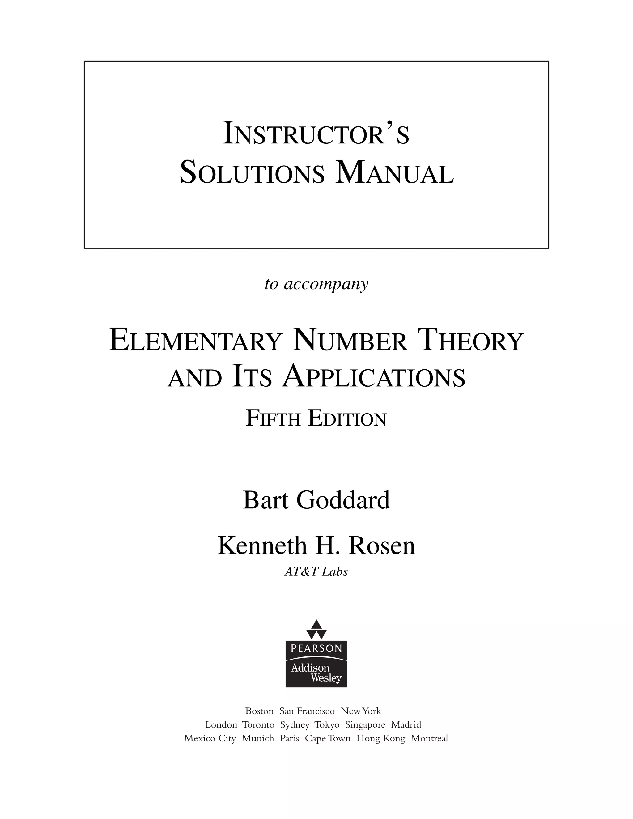 This document is the instructor's solutions manual for Elementary Number Theory and Its Applications, 5th Edition by Bart Goddard and Kenneth H. Rosen. It contains copyright information and solutions to exercises from Chapter 1 on the integers. The solutions provide step-by-step workings to problems involving properties of integers, number sets, floor and fractional part functions, and other topics related to elementary number theory.