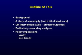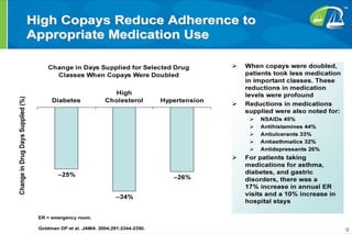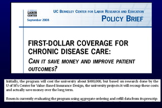 The document summarizes a presentation on value-based insurance design given at the University of Pennsylvania. It discusses how increasing cost-sharing reduces utilization of high-value health services and medications, leading to worse health outcomes. It presents a study that reduced copays for diabetes medications for University of Michigan employees, finding increased medication use and adherence, with the goal of improving health while containing costs. The presentation argues for insurance designs that incentivize use of services with clear health benefits.