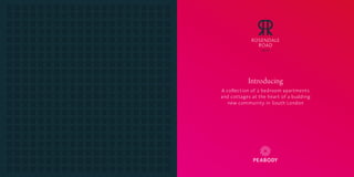 This document summarizes a collection of 2 bedroom apartments and cottages located at Rosendale Road in South London. The development is situated near popular areas like Brixton, Dulwich, and Camberwell, providing residents with excellent local amenities within short walking distances. The apartments and cottages offer superior finishes and energy efficient designs. Public transportation from the development provides quick access to destinations across Central and West London.