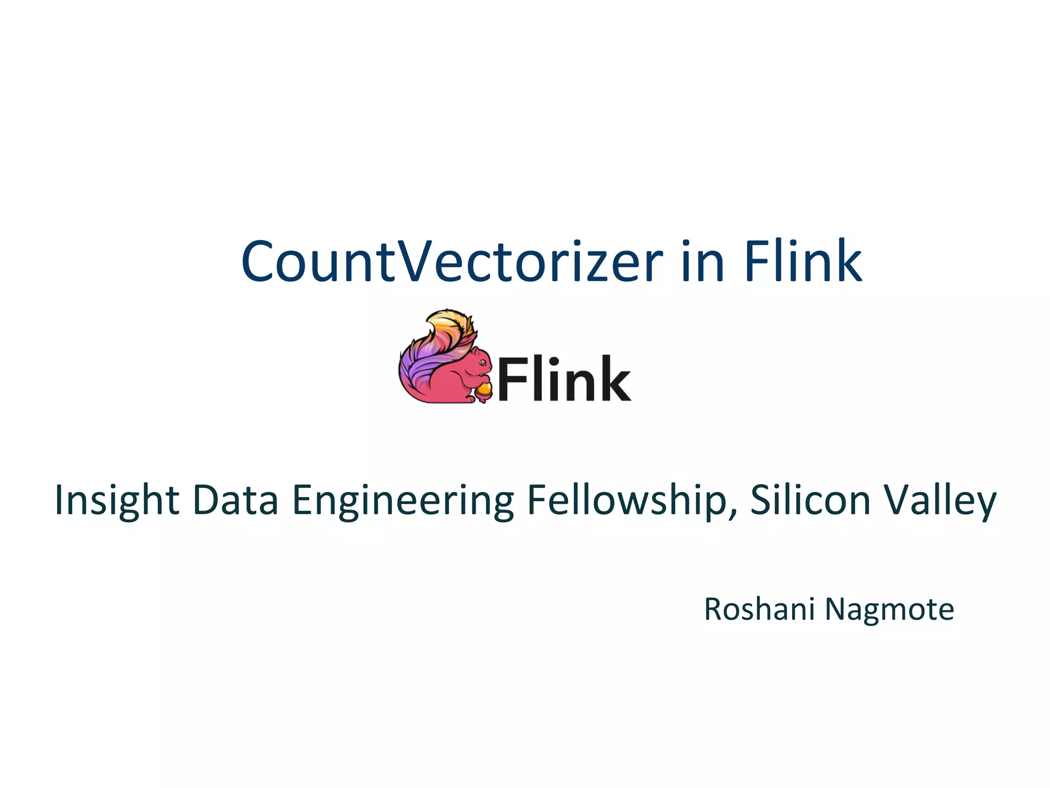 The document describes implementing a CountVectorizer in Apache Flink. CountVectorizer is a class in scikit-learn that transforms documents into feature vectors based on word frequency. The key functionality implemented includes fit(), which counts word frequencies, transform(), which transforms new documents, and get_feature_names(). Parameters like minDF, maxDF, stopwords and n-grams are also supported. Tests show the outputs match scikit-learn CountVectorizer. Sample applications include document similarity and word clouds.