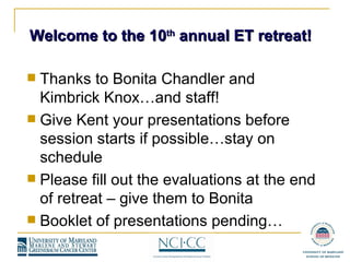 The document summarizes the activities of the Experimental Therapeutics program at an annual retreat. It discusses the program's aims of identifying new drug targets and mechanisms of drug resistance. It provides an overview of clinical trials and preclinical research underway, including studies on cell cycle targets, drug sensitivity and resistance, and novel cancer therapeutics. The document also reviews funding, publications, and plans to renew the program's P30 grant.