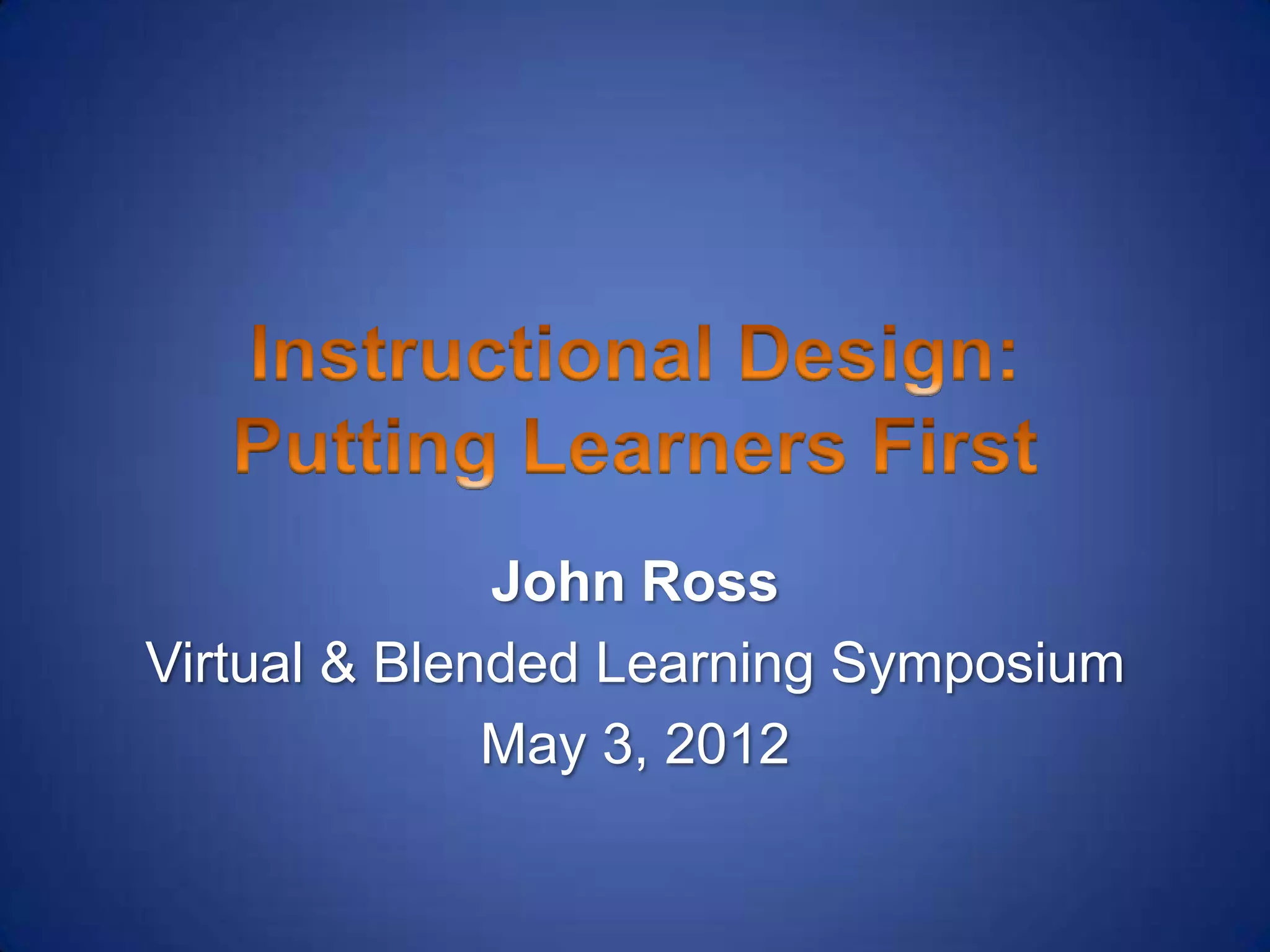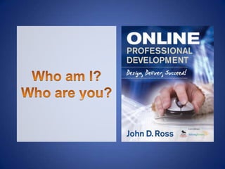 John Ross presented at a virtual and blended learning symposium on becoming an advocate for learners by exploring instructional design models and designing for the audience to increase motivation for learning. He discussed determining the appropriate technologies to support learning based on a continuum of adoption from replicating to transforming current practices. Good learning was characterized by one word: attention, relevance, confidence, and satisfaction. The systematic design of instruction was outlined including analyzing needs, setting objectives and assessments, developing instructional strategies, selecting materials, and conducting formative and summative evaluations.