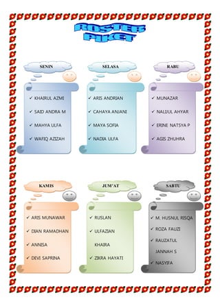 The document contains the class schedule for several days of the week, listing the subjects being taught each day and period. It also includes the roster of students in the class, identifying the class leader, secretary, treasurer, assistant leader and heads of security and cleanliness. The schedule shows the class has subjects like Arabic, Civic Education, Physics, English and more throughout the week, along with extracurricular activities.