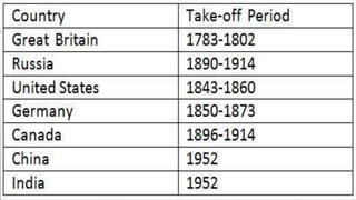 3. Take-off stage where industrialization increases and workers move to manufacturing.