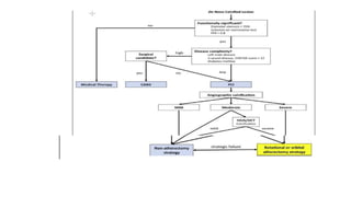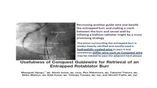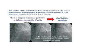 Rotational atherectomy (RA) is a technique used for treating heavily calcified coronary lesions, developed by David Auth in the 1980s, that relies on differential cutting to prepare lesions prior to stent deployment. The procedure utilizes specialized devices like the Rotalink burr catheter and requires careful management to minimize complications such as bradycardia, dissection, and slow flow. While RA can be effective for specific cases, it carries risks and has seen a decline in usage due to the complexity and associated costs.