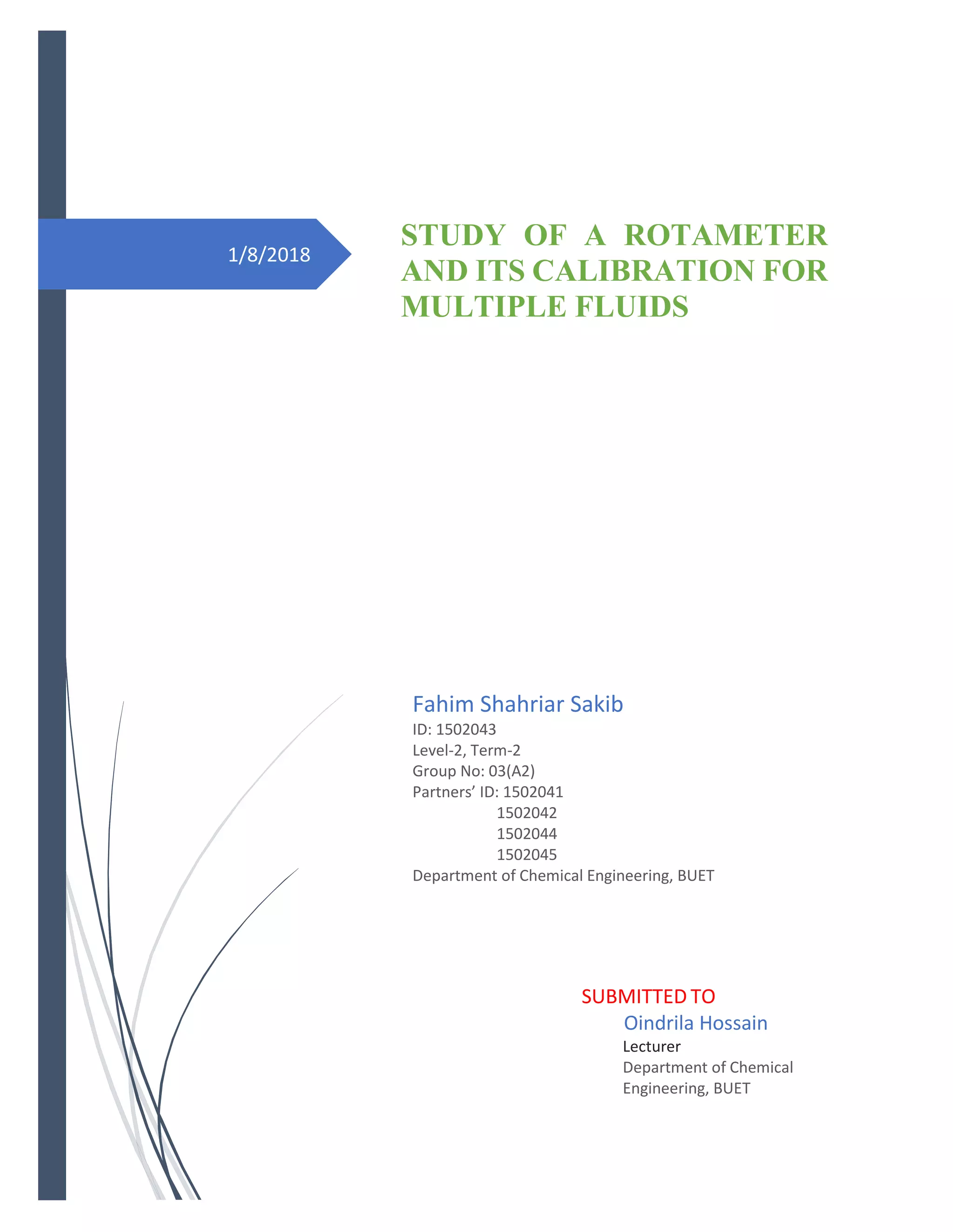 The study calibrated a rotameter for measuring the flow rates of multiple fluids. To calibrate the rotameter, the volumetric flow rate of water was measured for different rotameter readings by collecting water in a bucket over timed intervals. From the water flow rate readings, the rotameter coefficient (C) and Reynolds number (Re) were calculated and plotted against each other to obtain the calibration curve, which allows determining the flow rates of other fluids like kerosene from their properties and the rotameter reading.