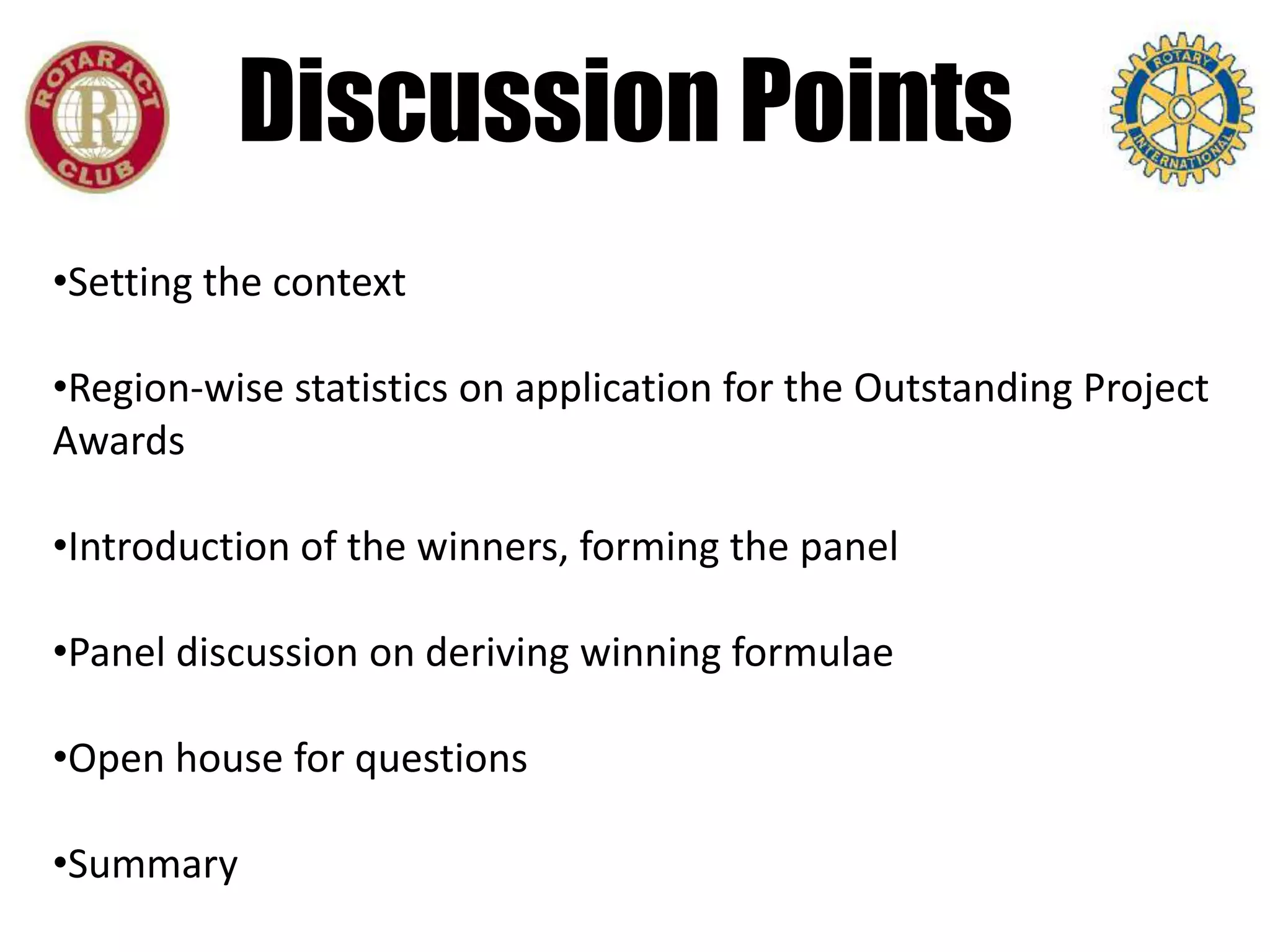 The document outlines the 2012 Rotaract Outstanding Project Awards, detailing the evaluation criteria for submitted service projects, which include collaboration, promotion, and innovation. It highlights the winners from different regions, such as Nepal, Ghana, and Turkey, and emphasizes the importance of member involvement and media engagement in project success. Discussion points include the challenges faced in creating impactful projects and the role of Rotary in supporting these initiatives.