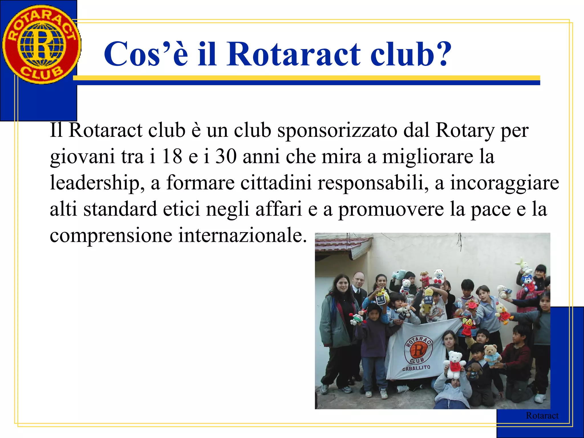 Il Rotaract Club è un'organizzazione sponsorizzata dal Rotary, rivolta a giovani tra i 18 e i 30 anni, che promuove leadership, etica e pace internazionale. Fondato nel 1968, il club si dedica a progetti di servizio comunitario, sviluppo professionale e attività di leadership. I soci possono costruire competenze e reti per diventare cittadini responsabili e produttivi nella società.