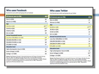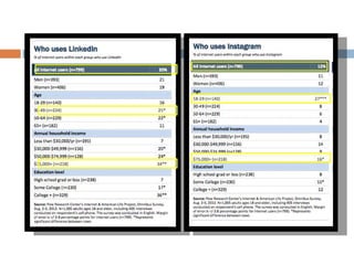 This document provides an overview of several major social media platforms - Facebook, Twitter, LinkedIn, and Instagram - and how they can be used for social media marketing. It describes the key features and user demographics of each platform, as well as tips and best practices for using them. The document emphasizes developing a social media strategy and giving one member responsibility for managing a club's planned social media presence and messaging.