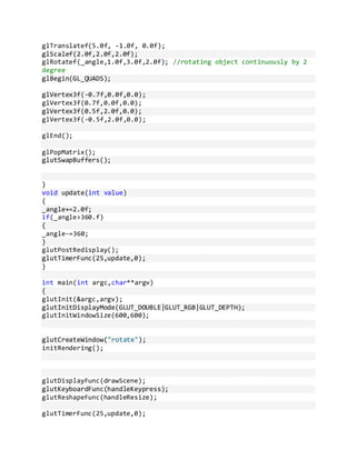 This document contains C++ code for 3D graphics rendering using OpenGL. It defines functions for initializing rendering, handling user input, resizing the window, drawing a rotating 3D object, and updating the rotation over time. The main function sets up the window and rendering context, registers callbacks, and starts the main loop to continuously redraw the rotating object.