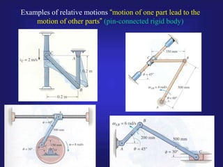 1) The document discusses relative and non-relative motions of connected rigid bodies using examples of pin connections. It defines relative velocity and acceleration and discusses the Coriolis acceleration that arises from rotating frames of reference.