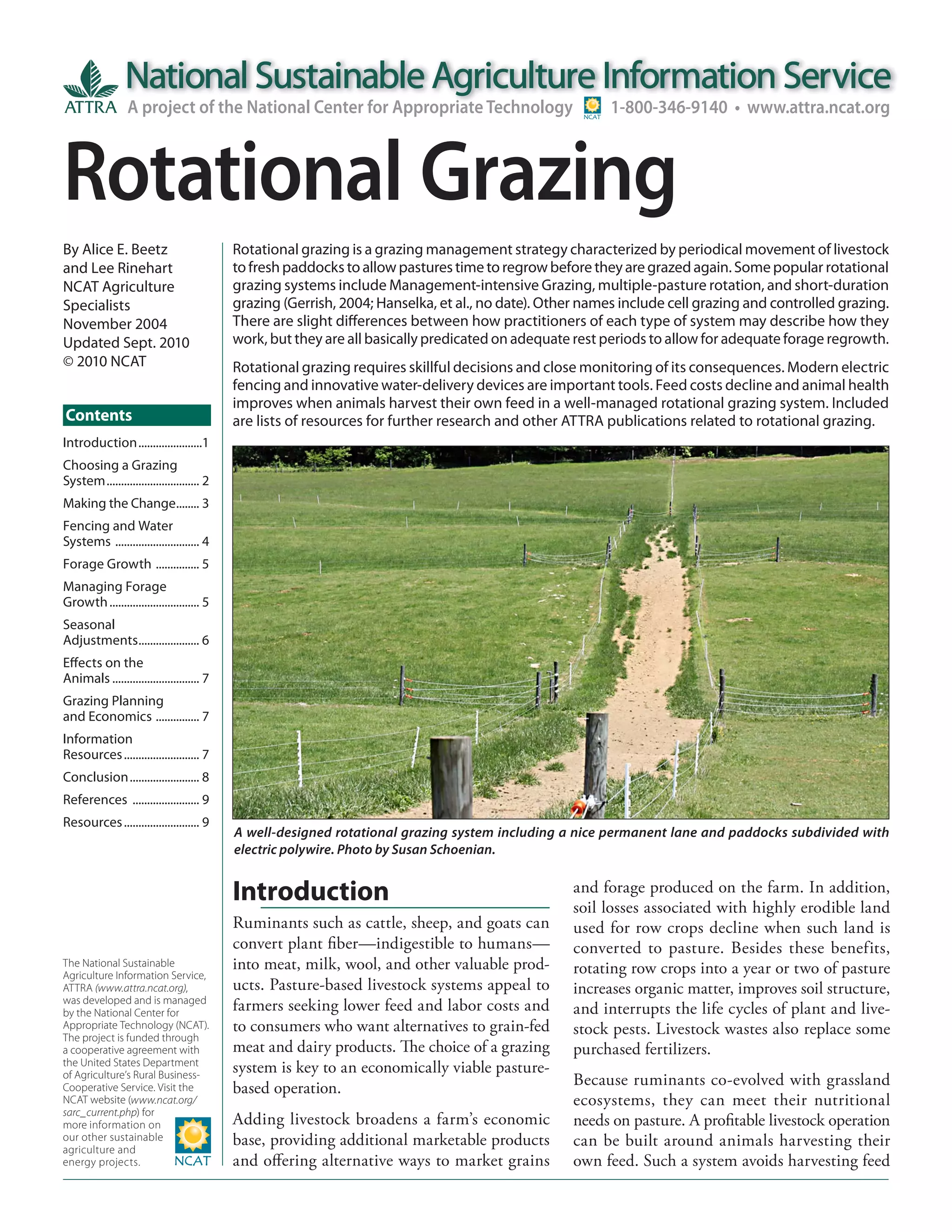 Rotational grazing is a grazing management strategy that involves periodically moving livestock to fresh paddocks to allow pastures time to regrow before being grazed again. This improves forage quality and quantity compared to continuous grazing by preventing overgrazing. Setting up an effective rotational grazing system requires subdividing fields into paddocks, providing water sources, adjusting stocking rates, and close monitoring. While it requires more fencing and infrastructure initially, rotational grazing can reduce feed costs and improve animal health. With careful planning and management, rotational grazing can increase the productivity and profitability of pasture-based livestock operations.