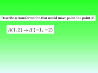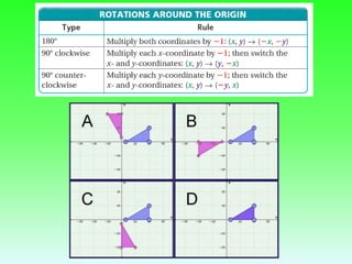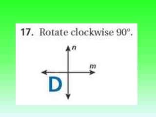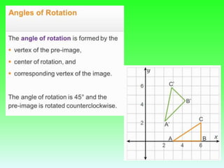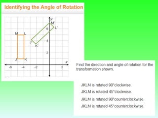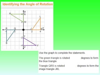 The document discusses rotations and transforming figures using rotations. It provides examples of rotating a triangle 180 degrees about the origin by multiplying the coordinates by -1. It also lists some Virtual Nerd links on rotations for 90, 180, and 270 degrees around the origin. Finally, it asks if there are any questions after learning about rotations and mentions next steps like a shapes in motion activity and a quiz.