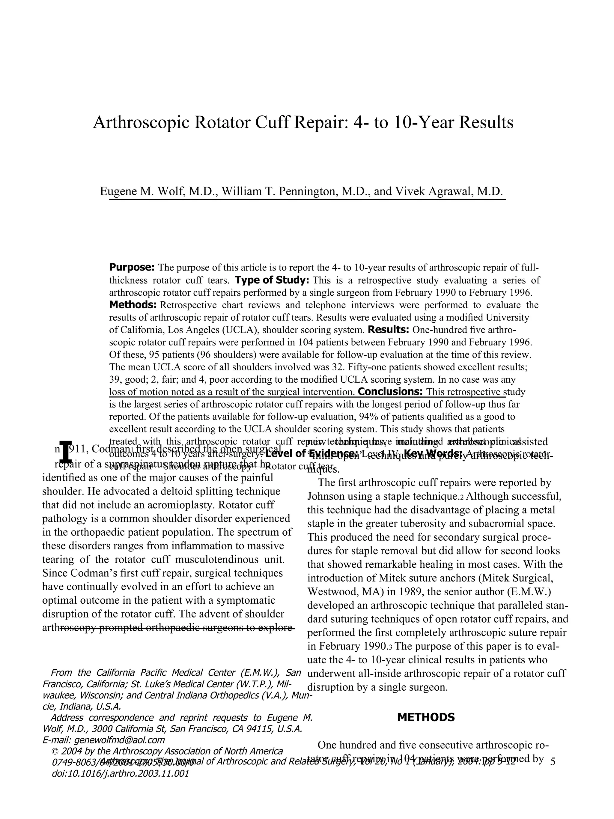 This study retrospectively evaluated the 4- to 10-year results of 105 arthroscopic rotator cuff repairs performed by a single surgeon between 1990-1996. At average follow-up of 75 months, 94% of the 95 patients available had good to excellent results according to the modified UCLA shoulder scoring system. The study demonstrates that arthroscopic rotator cuff repair can provide excellent long-term clinical outcomes for repair of full-thickness rotator cuff tears.