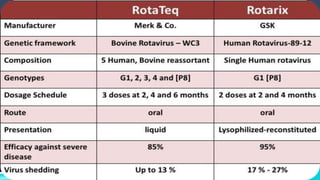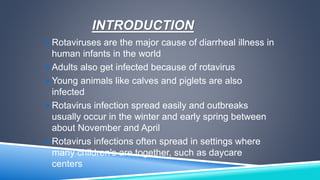 Rotavirus is a major cause of diarrhea in infants and young children worldwide. It spreads easily between people through contaminated food or surfaces. The virus causes infection and inflammation of the intestinal tract, leading to diarrhea and dehydration. Diagnosis involves detecting the virus in stool samples using tests like ELISA or electron microscopy. Treatment focuses on rehydration through oral rehydration therapy. Handwashing and sanitation can help prevent transmission. Two live, oral rotavirus vaccines provide protection against severe diarrhea from the most common strains.