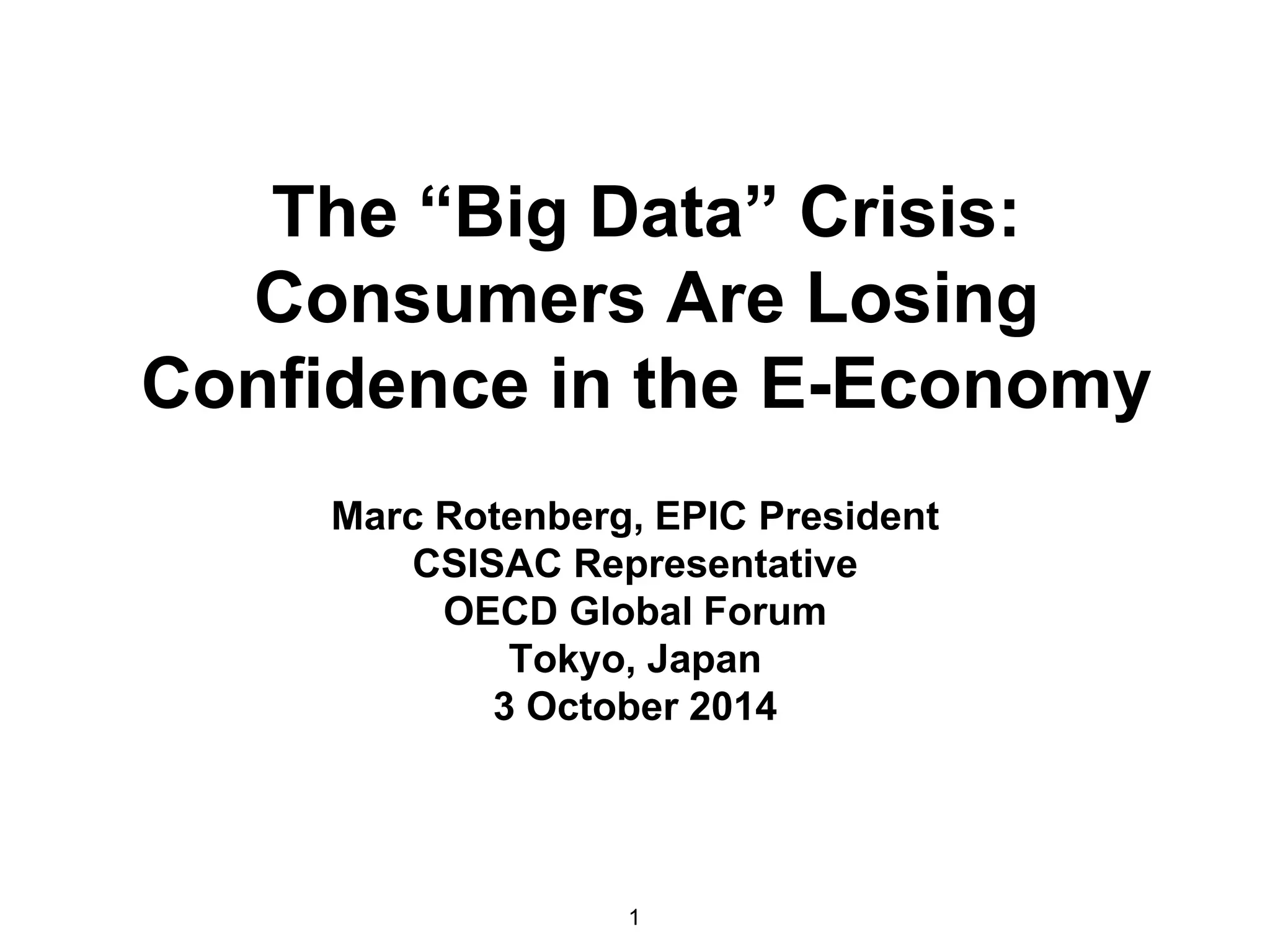 The document discusses how consumers are losing confidence in the digital economy due to issues with big data practices. It notes that consumers experience frequent data breaches, credit card and password theft. Identity theft has become the top consumer concern in the US and predictive policing raises new issues. The problems will worsen as more personal data is collected but security and business practices remain weak. Solutions proposed include improving payment security, updating privacy laws, and developing metrics to monitor privacy, security and consumer protection issues related to big data.