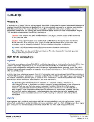 This document discusses Roth 401(k) plans, which allow employees to make after-tax contributions to their 401(k) plans. Key details include: