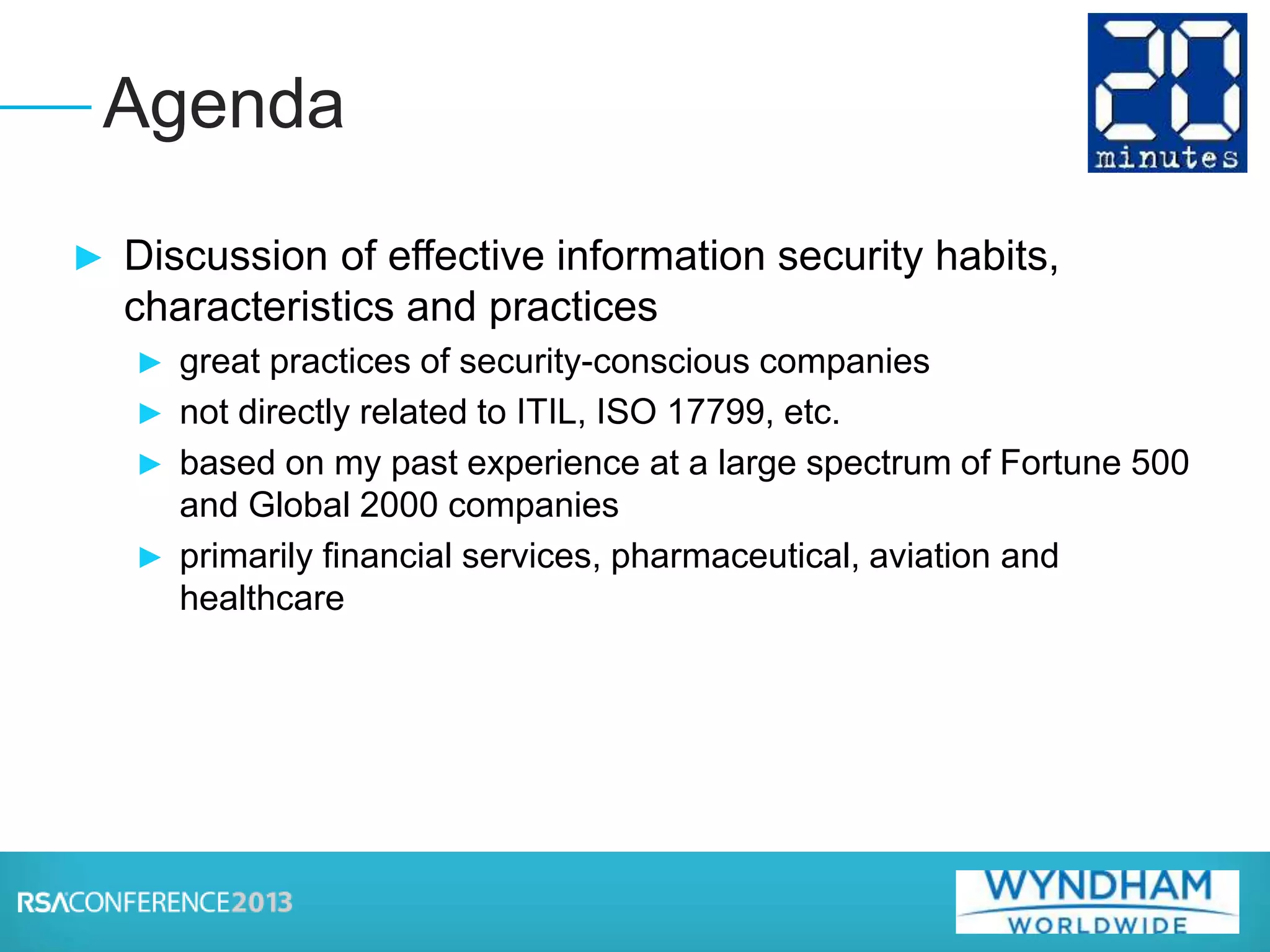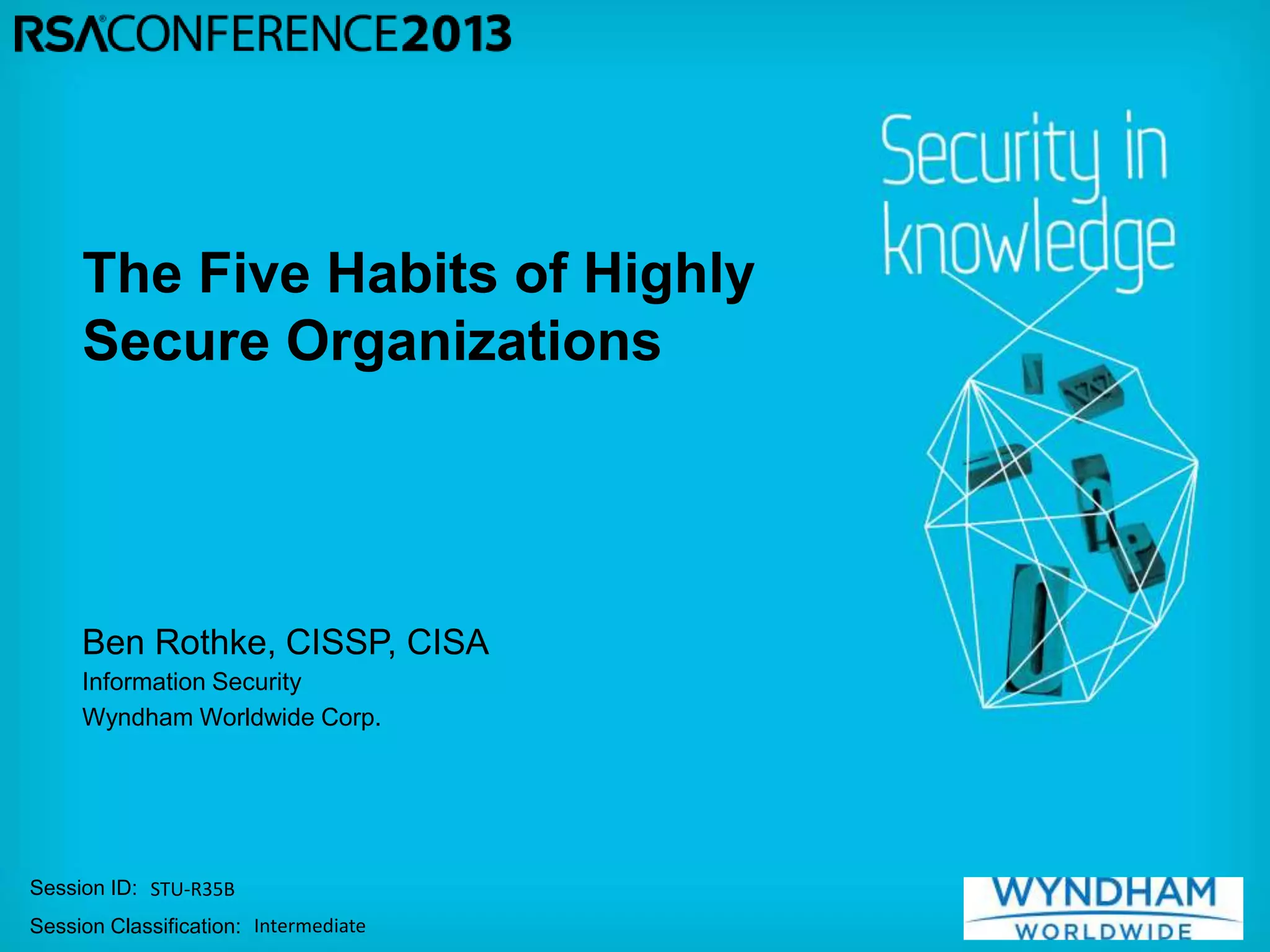 The document discusses the five habits of highly secure organizations according to Ben Rothke, CISSP, CISA and Manager of Information Security at Wyndham Worldwide Corp. The five habits are: having a Chief Information Security Officer (CISO), implementing a comprehensive risk management program, investing in people over security products, establishing policies and procedures, and conducting security awareness training. Effective information security requires leadership, commitment, knowledge and dedication through focusing on these five habits.