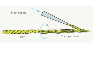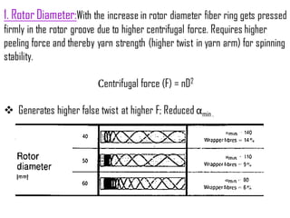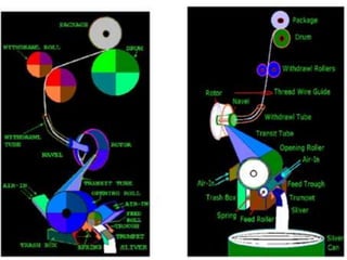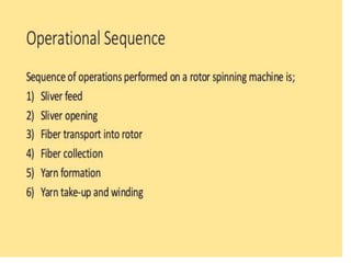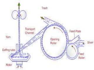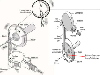 The document discusses rotor spinning technology. It describes the key tasks of a rotor spinning machine including opening fibers, cleaning, homogenizing, combining, ordering, improving evenness, imparting strength, and winding. It provides a historical overview of rotor spinning development from the 1930s to present day. It then details the major components and processes involved, including fiber feeding, separation and transport, fiber collection and alignment on the rotor, yarn formation through twist insertion, and yarn take-off and winding. The principles of rotor spinning and factors that influence yarn twist and quality are also summarized.