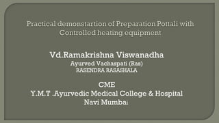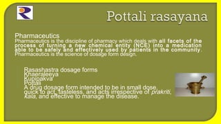 1. Pottali is an Ayurvedic dosage form that produces small, quick-acting, tasteless doses that are effective irrespective of an individual's constitution, season, or disease.