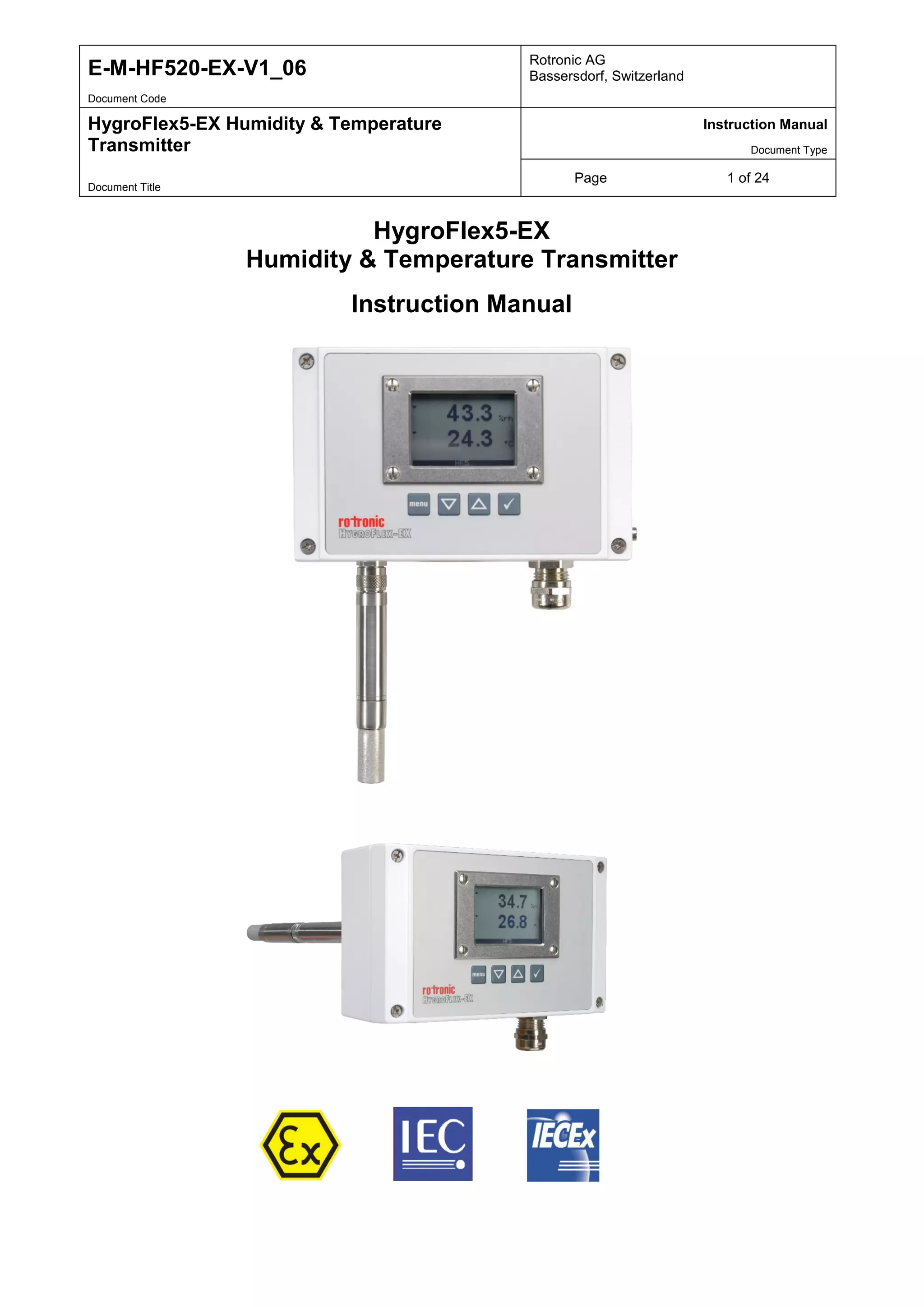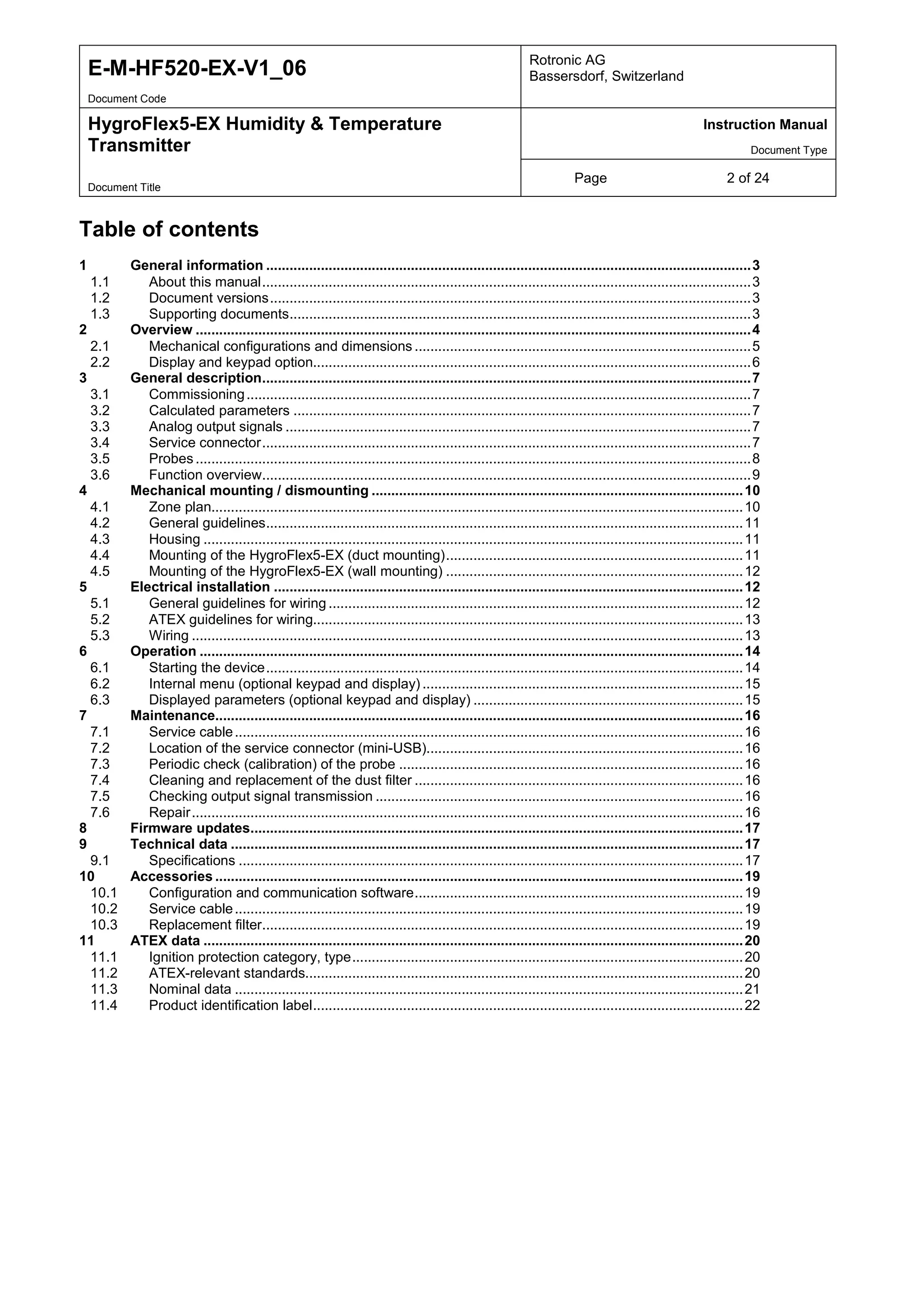 This document is the instruction manual for the HygroFlex5-EX humidity and temperature transmitter. It provides general information about the transmitter, an overview of its features and components, and instructions for mechanical installation, electrical installation, operation, maintenance, and firmware updates. The transmitter is designed for fixed installation in applications requiring high measurement accuracy and can measure humidity from 0-100% RH and temperature from -100 to 200°C. It has two analog outputs and a digital service interface.