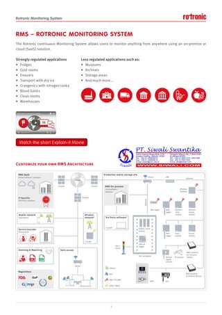 The document outlines the features and benefits of the Rotronic Continuous Monitoring System (RMS), which enables real-time environmental monitoring for various applications through both cloud-based and on-premise solutions. It emphasizes compliance with regulatory standards such as FDA and GxP, and provides customizable monitoring options for critical environments like blood banks and clean rooms. Additionally, the system includes advanced alarming protocols, data security measures, and the integration of third-party devices, ensuring comprehensive monitoring and reporting capabilities.