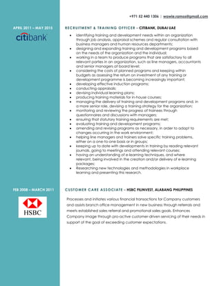 Rouella Ramos has worked in recruitment, training, and customer service roles for banks and other companies in Dubai and the Philippines since 2008. Her most recent role is as a sales and service representative for Dubai Islamic Bank, where she is responsible for answering client queries, presenting new products, and achieving sales targets. Previously she held recruitment and training officer roles at Citibank Dubai and Paris Gallery, and began her career in customer service at HSBC and Apac Customer Service. She has a bachelor's degree in psychology, business administration, and education.