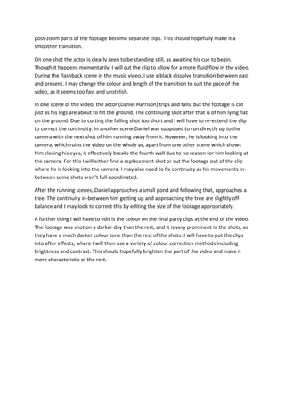 The document provides a summary of the rough edit of a music video and discusses areas for improvement. It identifies issues such as uneven audio transitions, shaky camera shots, out of focus footage, zooming problems, continuity errors, and inconsistent color tones. The author plans to address these problems through techniques like smoothing audio transitions, stabilizing footage, replacing low quality clips, adjusting shot timing, and applying color correction to achieve a more polished final edit.