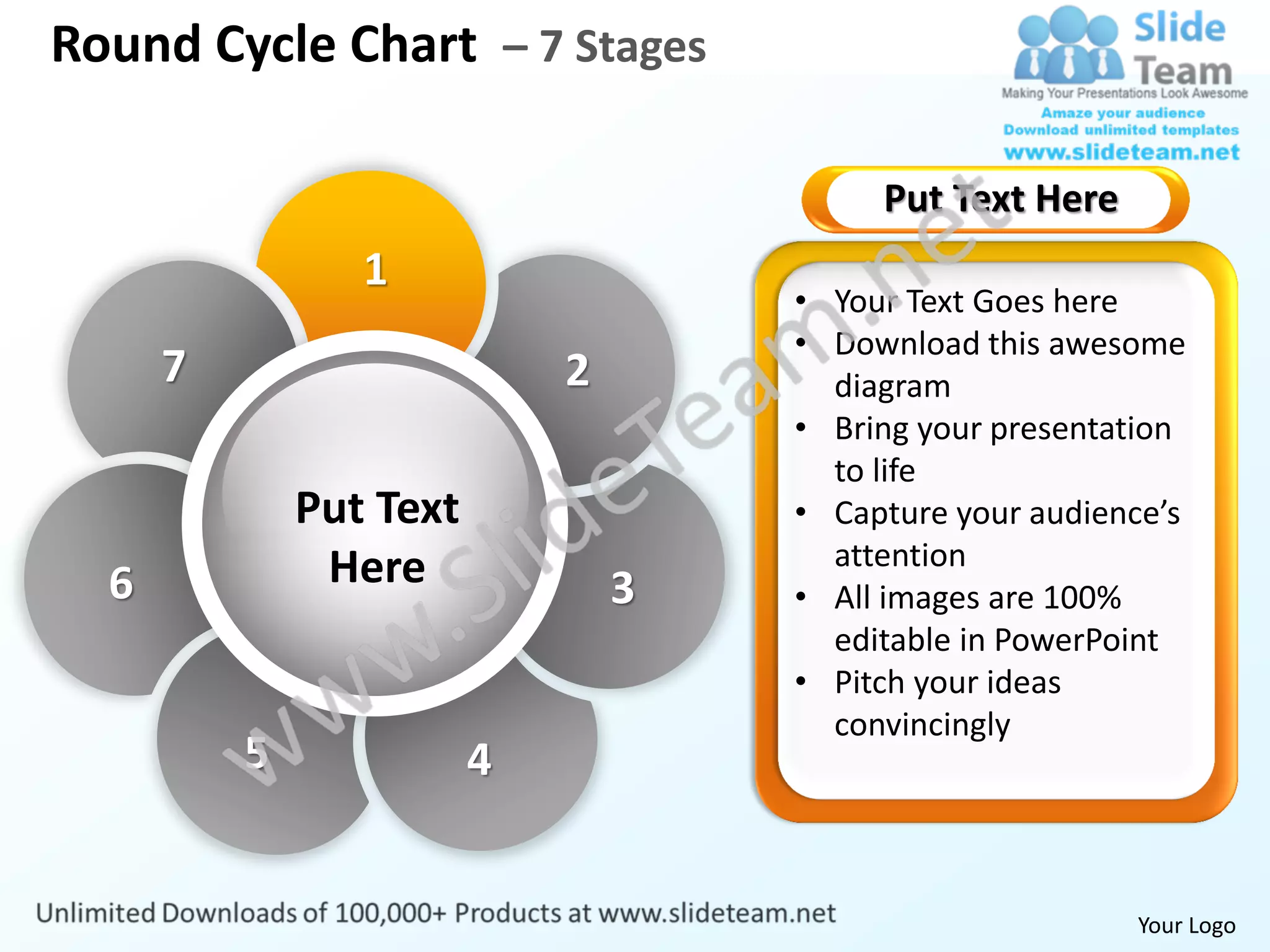 The document describes a round cycle chart with 7 stages. It encourages adding text to each stage and downloading the diagram. The diagram consists of a circle divided into 7 sections, with instructions to customize the text and images in each section. The purpose is to bring presentations to life, capture audiences' attention, and pitch ideas convincingly. All images in the chart can be edited in PowerPoint by changing properties like color, size, and orientation.