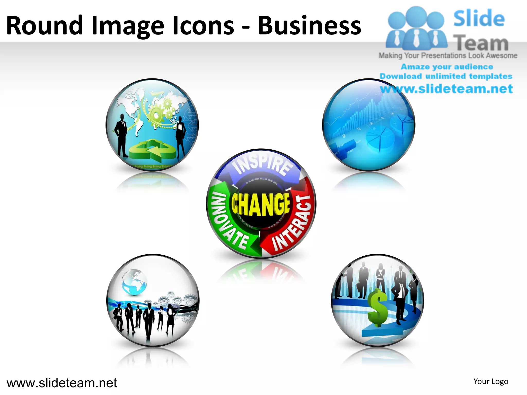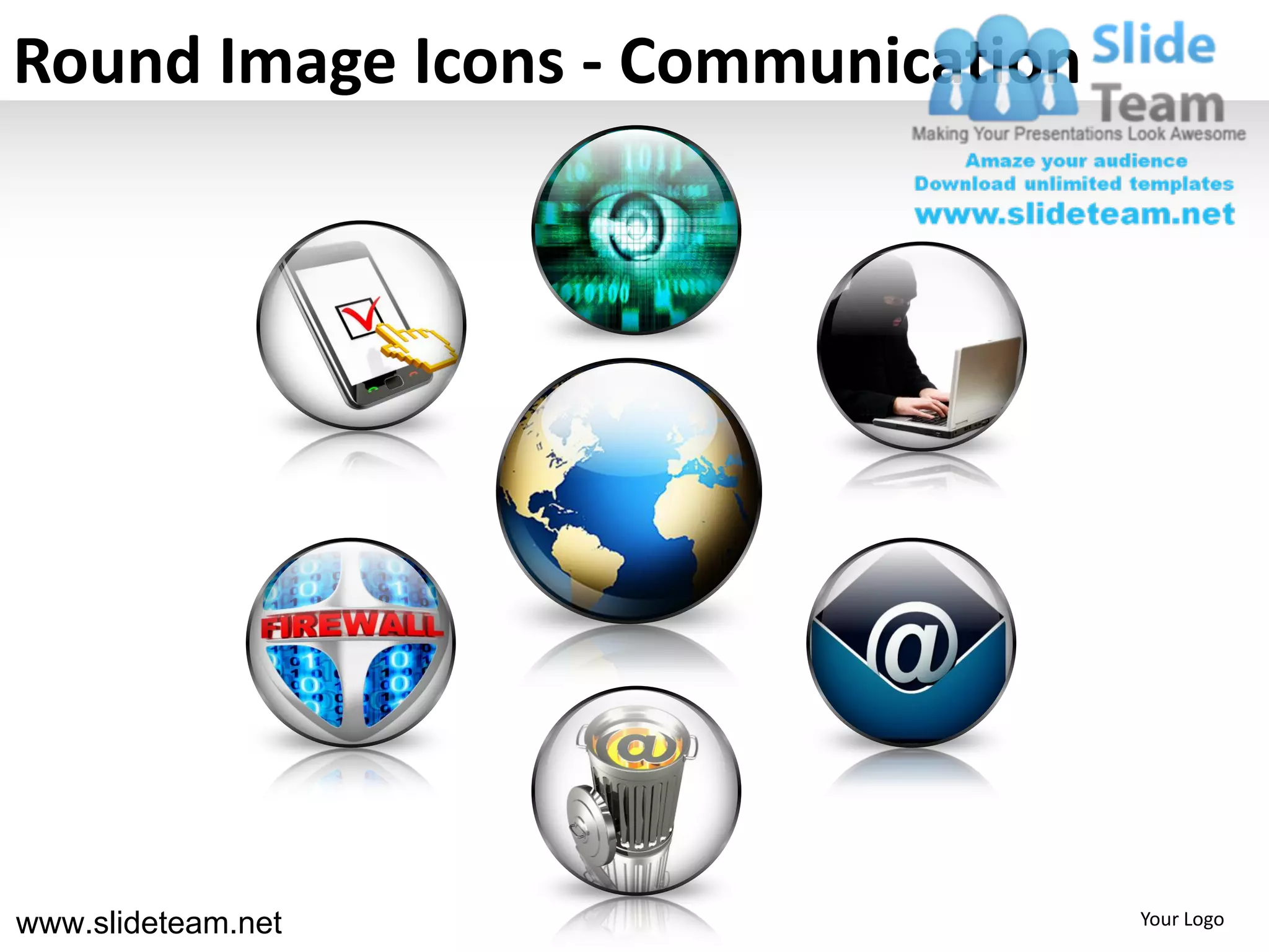The document showcases a collection of round image icons that can be used in business presentations. It includes icons for business, communication, industrial, teamwork, medical, construction, America, finance, nature, success, abstract, and music. Each icon slide provides instructions for adding text, downloading the diagram, bringing the presentation to life, and capturing the audience's attention. The icons are fully editable in PowerPoint and aim to enhance presentations.